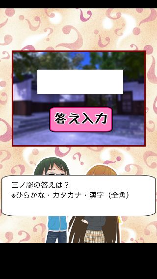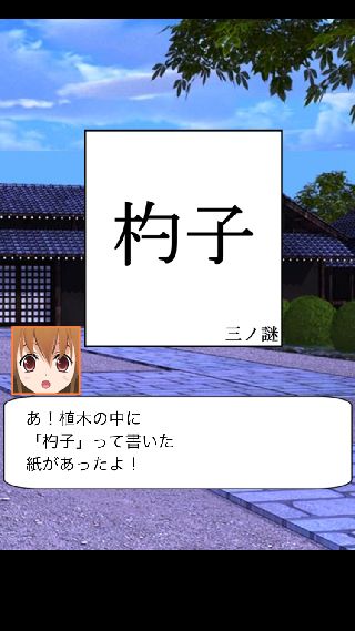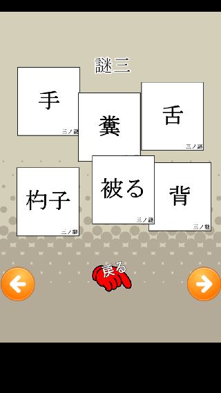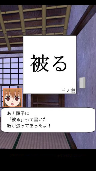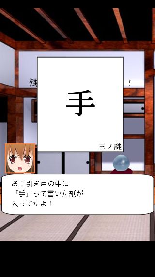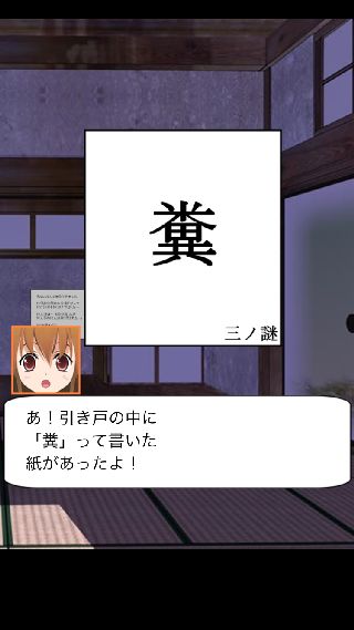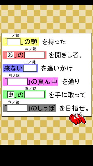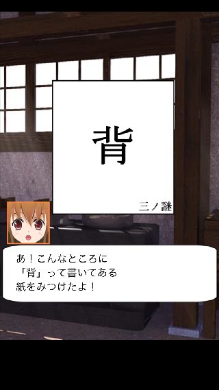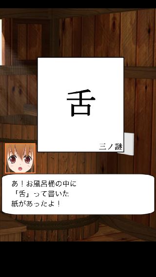 謎解き脱出ゲーム 星空物語4 謎解き屋敷の宝物庫 無料 0 評価する 送信する 三ノ謎 スタート地点の右の茂みから「杓子の紙」を入手。 樽風呂の中から「舌の紙」を入手。 水晶の部屋の下の棚から「手の紙」を入手。 張り紙の部屋の右の棚から「糞の紙」を入手。 台所から「背の紙」を入手。 隠し部屋の奥から「被るの紙」を入手。 6枚の文字はそれぞれ、ネコに関係する言葉や慣用句になる。 『猫の手も借りたい』 『猫が糞を踏む』 『猫舌』 『猫も杓子も』 『猫を被る』 『猫背』 『緑の巻物』の『三ノ謎』をタップする。 『ねこ(ネコ)』を入力する。 巻物の入手 一ノ謎 二ノ謎 三ノ謎 四ノ謎 五ノ謎 六ノ謎 水晶の謎 トゥルーエンド おまけ問題ヒント