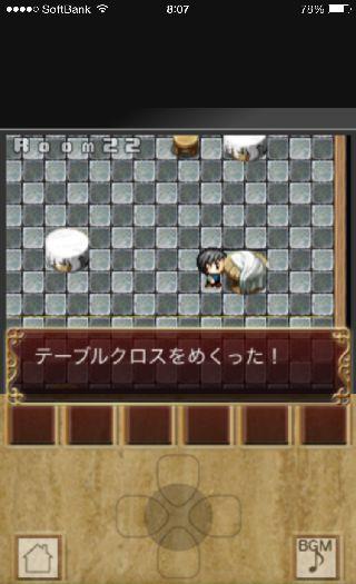 2D脱出ゲーム Rooms Quest -ドット絵の世界へようこそ- 無料 0 評価する 送信する Room 22 右上の半分めくれたテーブルクロスを調べる。 この時、全てのテーブルと椅子の位置を確認して、テーブルクロスが敷かれたものを白、その他を黒とすると以下の配置になる。 ● ○ ● ○ ● ● ○ ○ ○ ● ● ● ● ● ○ ● テーブルクロスから「扉のカギ」を入手して、上の扉を開ける。 Room 1 Room 2 Room 3 Room 4 Room 5 Room 6~7 Room 8 Room 9 Room 10 Room 11 Room 12 Room 13 Room 14 Room 15 Room 16~17 Room 18~19 Room 20 Room 21 Room 22 Room 23 Room 24 Room 25 Room 26 Room 27 Room 28 Room 29 Room 30 Room 31 Room 32 Room 33 Room 34 Room 35 Room 36 Room 37 Room 38 Room 39 Room 40 Room 41 Room 42 Room 43 Room 44 Room 45 Room 46 Room 47 Room 48 Room 49 Room 50 その1 Room 50 その2