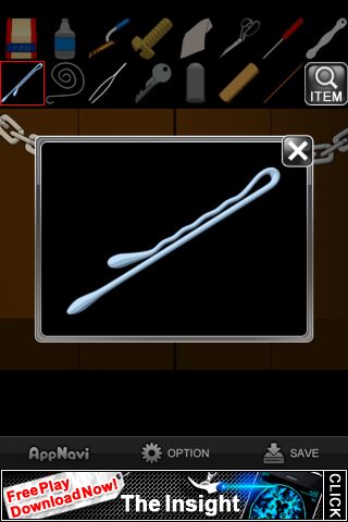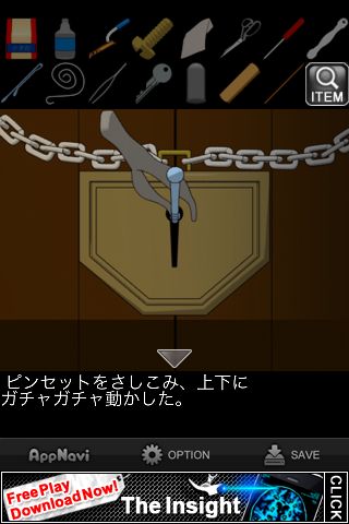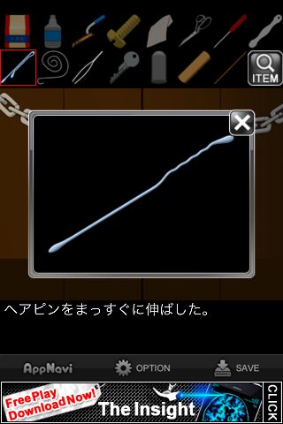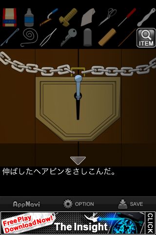 脱出ゲーム "ダイイングメッセージ後編" 無料 0 評価する 送信する IDAC CO.,LTD.(WaveA PTE.LTD.) 攻略その8 「ヘアピン」をまっすぐに伸ばす。 錠前に「ヘアピン」と「ピンセット」を差し込む。 カギが外れて脱出。 攻略その1 攻略その2 攻略その3 攻略その4 攻略その5 攻略その6 攻略その7 攻略その8