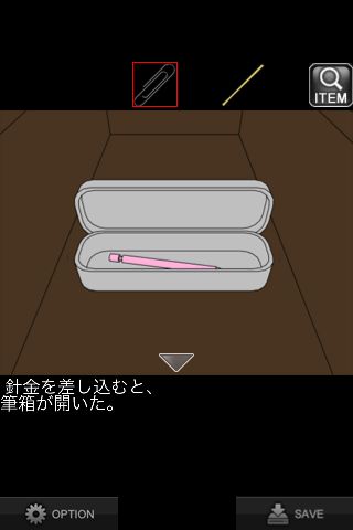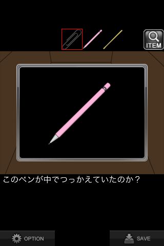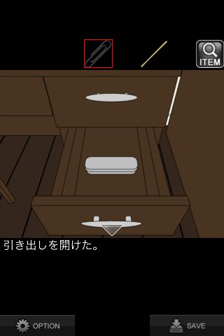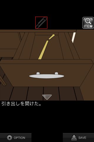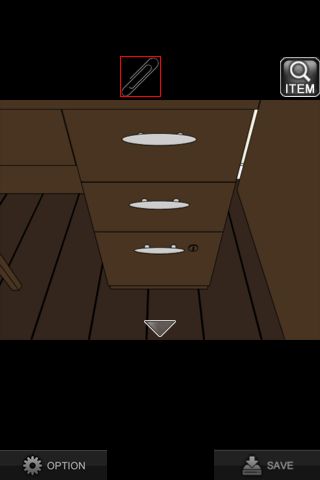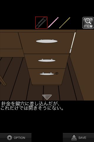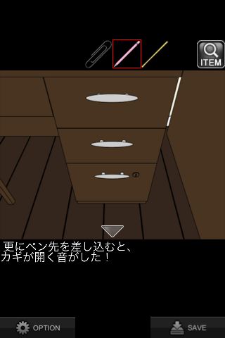一番下の引き出しの鍵穴に「針金」を使い、さらに「ペン」を差し込む。