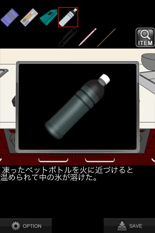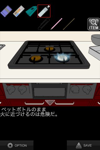 「ペットボトル」を近づけて溶かし、もう一度近づけて『火に近づけるのは危険だ』のメッセージを出す。