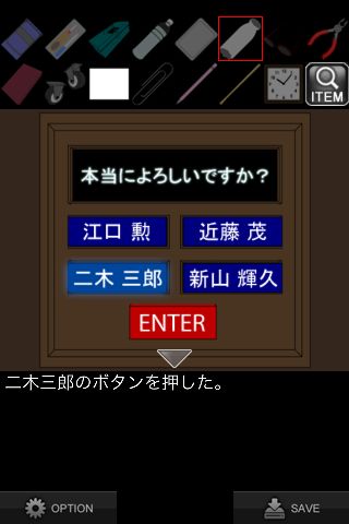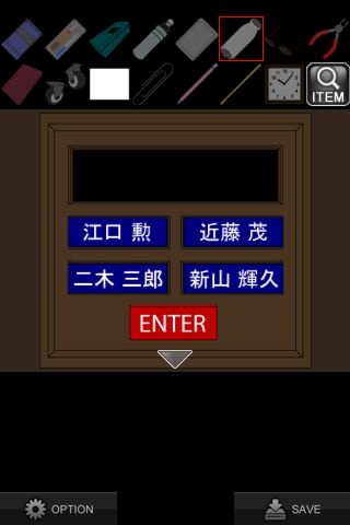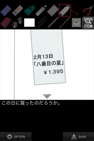 脱出ゲーム "特殊清掃~無言の恨み" 無料 0 評価する 送信する IDAC CO.,LTD.(WaveA PTE.LTD.) 攻略その9 4カ所の本の栞を調べる。 日付の順に並べて、タイトルの一文字目を拾うと『8671』となる。 ソファーの名刺入れを調べて、『8671』が電話番号になっている『二木三郎』を確認。 扉の前へ。 『二木三郎』のボタンを押す。 脱出。 攻略その1 攻略その2 攻略その3 攻略その4 攻略その5 攻略その6 攻略その7 攻略その8 攻略その9
