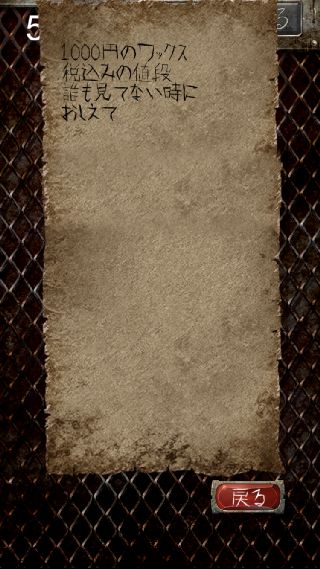償いの塔 無料脱出ゲーム 無料 0 評価する 送信する natukumo 5階 監視の目をかいくぐり 指示書を確認。 パスコード入力で、『1080』に合わせる。 ※ アプリリリース時の消費税率8%にて計算する。 郵便受けを覗くで、目が出現していない状態にする。 1階 命の価値は 2階 赤いガソリン 3階 障子にメアリー 4階 無邪気の邪 5階 監視の目をかいくぐり 6階 何人捕まえた 7階 アハハハハ 8階 嘘つきを殺せ 9階 罪の代償 10階 カラーとナンバー 11階 審判の騎士 12階 愛の女神 13階 粛清の執行人 14階 首狩り族 15階 絶対の王 16階 時空の騎士 17階 紫閃の騎士 18階 骸骨の王 19階 性欲と抑制 20階 罪深き者達