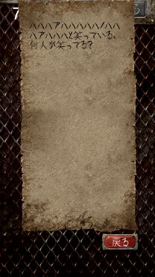 償いの塔 無料脱出ゲーム 無料 0 評価する 送信する natukumo 7階 アハハハハ 指示書を確認。 『母は「アハハ」、母の母は「アハハハ」と笑っている。』 パスコード入力で、『0002』に合わせる。 1階 命の価値は 2階 赤いガソリン 3階 障子にメアリー 4階 無邪気の邪 5階 監視の目をかいくぐり 6階 何人捕まえた 7階 アハハハハ 8階 嘘つきを殺せ 9階 罪の代償 10階 カラーとナンバー 11階 審判の騎士 12階 愛の女神 13階 粛清の執行人 14階 首狩り族 15階 絶対の王 16階 時空の騎士 17階 紫閃の騎士 18階 骸骨の王 19階 性欲と抑制 20階 罪深き者達