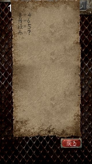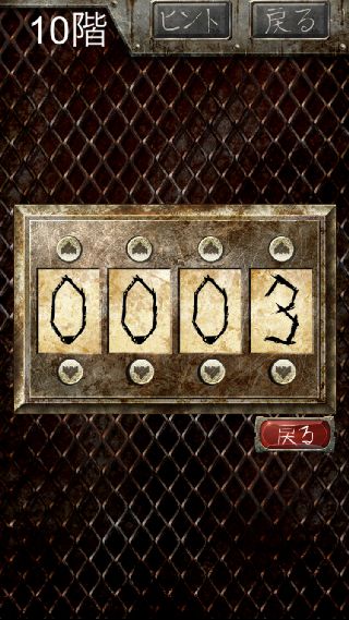 償いの塔 無料脱出ゲーム 無料 0 評価する 送信する natukumo 10階 カラーとナンバー 指示書を確認。 色の名前を英語にした時の文字数。 パスコード入力で、『0003』に合わせる。 1階 命の価値は 2階 赤いガソリン 3階 障子にメアリー 4階 無邪気の邪 5階 監視の目をかいくぐり 6階 何人捕まえた 7階 アハハハハ 8階 嘘つきを殺せ 9階 罪の代償 10階 カラーとナンバー 11階 審判の騎士 12階 愛の女神 13階 粛清の執行人 14階 首狩り族 15階 絶対の王 16階 時空の騎士 17階 紫閃の騎士 18階 骸骨の王 19階 性欲と抑制 20階 罪深き者達