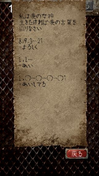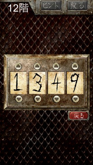 償いの塔 無料脱出ゲーム 無料 0 評価する 送信する natukumo 12階 愛の女神 指示書を確認。 携帯電話のフリック入力。 パスコード入力で、『1349』を入力する。 1階 命の価値は 2階 赤いガソリン 3階 障子にメアリー 4階 無邪気の邪 5階 監視の目をかいくぐり 6階 何人捕まえた 7階 アハハハハ 8階 嘘つきを殺せ 9階 罪の代償 10階 カラーとナンバー 11階 審判の騎士 12階 愛の女神 13階 粛清の執行人 14階 首狩り族 15階 絶対の王 16階 時空の騎士 17階 紫閃の騎士 18階 骸骨の王 19階 性欲と抑制 20階 罪深き者達