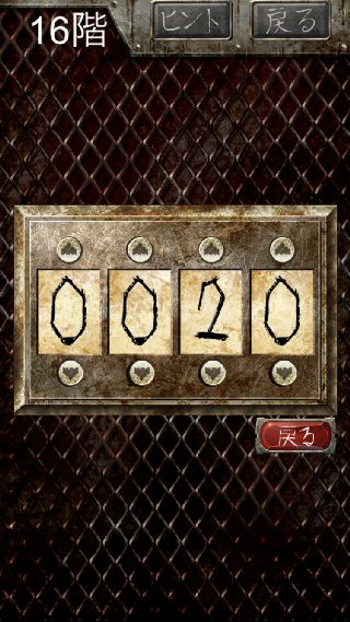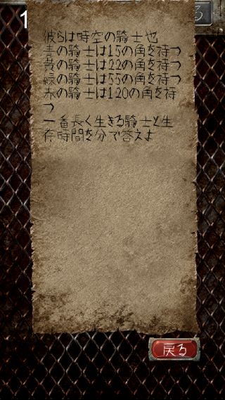 償いの塔 無料脱出ゲーム 無料 0 評価する 送信する natukumo 16階 時空の騎士 指示書を確認。 数字は角度を表している。 時計の文字盤の1時間は30°なので、一番大きい120°は『長針が4まで動く分数=20分』になる。 パスコード入力で、『0020』に合わせる。 ランプボタン入力で、『赤』を押す。 1階 命の価値は 2階 赤いガソリン 3階 障子にメアリー 4階 無邪気の邪 5階 監視の目をかいくぐり 6階 何人捕まえた 7階 アハハハハ 8階 嘘つきを殺せ 9階 罪の代償 10階 カラーとナンバー 11階 審判の騎士 12階 愛の女神 13階 粛清の執行人 14階 首狩り族 15階 絶対の王 16階 時空の騎士 17階 紫閃の騎士 18階 骸骨の王 19階 性欲と抑制 20階 罪深き者達