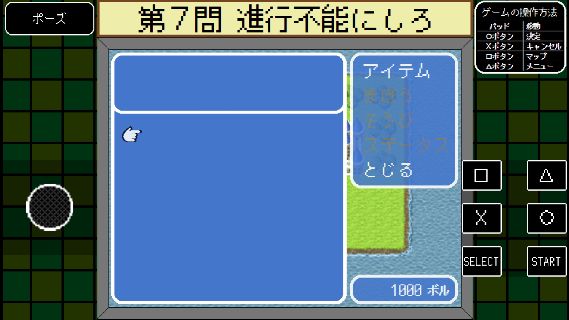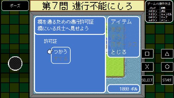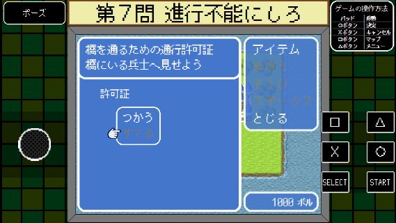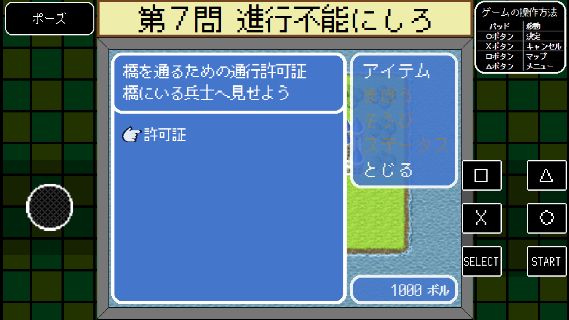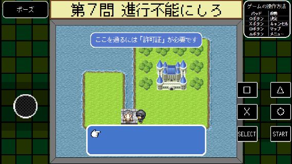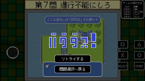バグダス - デバッガー検定 - 無料 5.0 評価する 送信する Jiruo Software 第7問 進行不能にしろ 『△』ボタンでメニューを開く。 『アイテム』『許可証』を選択する。 矢印を下に動かして、『すてる』を選択する。 衛兵に話しかける。 第1問 間違いを見つけろ 第2問 フリーズさせろ・1 第3問 街へ入れ 第4問 バグを見つけろ・1 第5問 フリーズさせろ・2 第6問 ゴールへ辿り着け 第7問 進行不能にしろ 第8問 バグを見つけろ・2