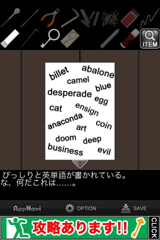スタート地点に貼られている紙にアルファベットが並んでいるので、『仕事=business』『絵画=art』『ラクダ=camel』『自暴自棄=desperade』となる。
