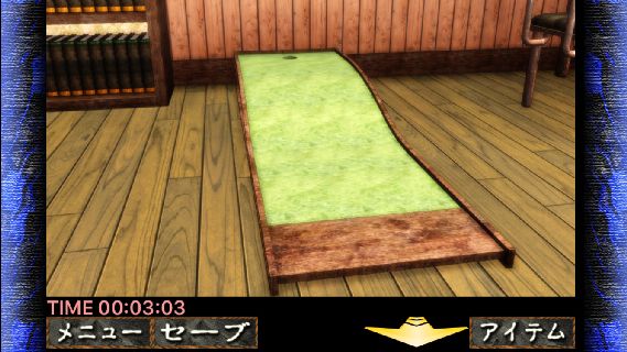 下のパット練習台のカップに「ゴルフボール」を入れる。