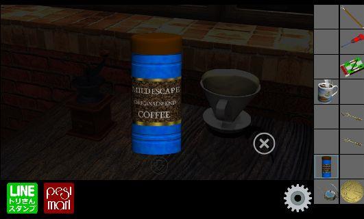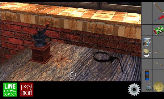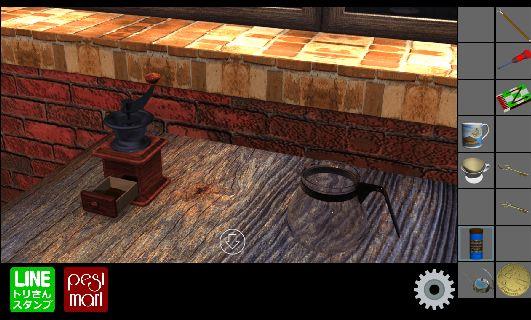 テーブルの上のコーヒーミルに「コーヒー豆」を入れて、引き出しを開ける。