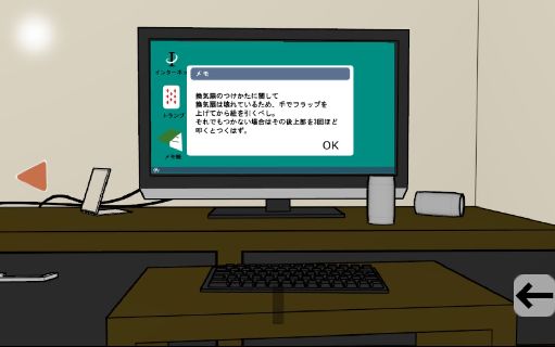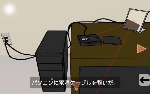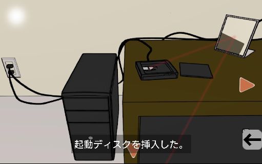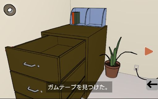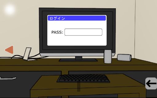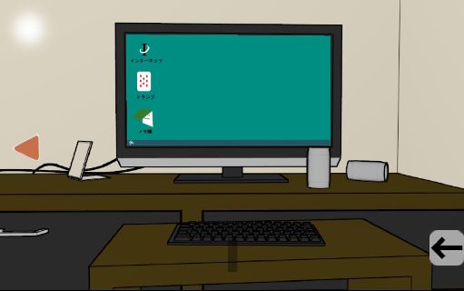 脱出ゲーム:取っ手のないドア 無料 0 評価する 送信する 攻略その4 パソコン本体の後ろに「何かのケーブル」を繋げて、「ディスク」を挿入する。 右に移動。 パスワード『15264』を入力する。 メモ帳ファイルを開いて、換気扇の動かし方を確認。 ベッドと窓の前に移動。 換気扇を拡大して、ブラインドを手で押し上げる。 ヒモを引っ張って動かないのを確認して、換気扇の上部を3回タップする。 下に落ちた「鍵」を入手。 棚の前に移動。 一番上の引き出しを「鍵」で開けて、「ガムテープ」を入手。 攻略その1 攻略その2 攻略その3 攻略その4 攻略その5