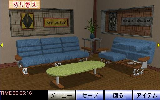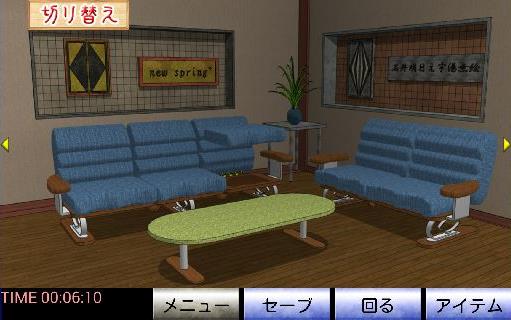 左のソファーの左端のクッションを持ち上げて、「白い脱出バッジ」を入手。