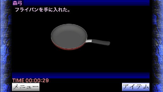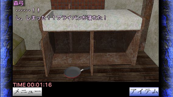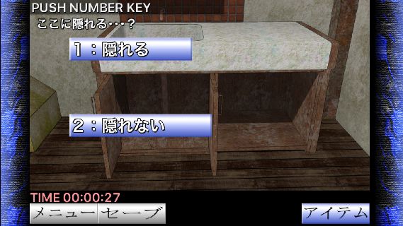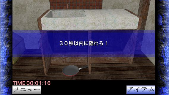 「フライパン」を入手して、棚の中を調べて『1:隠れる』を選択する。