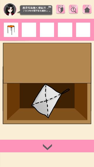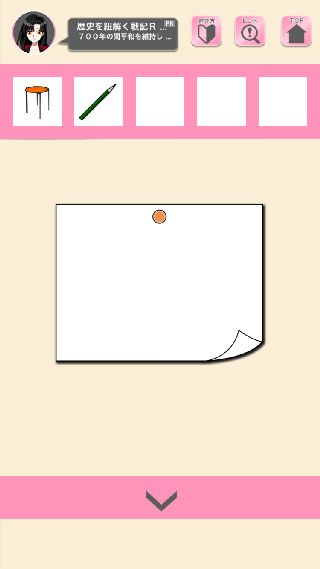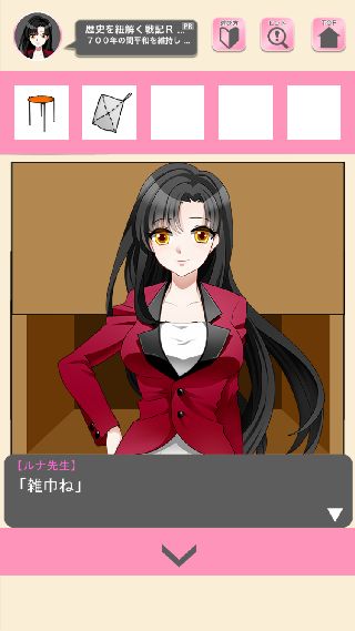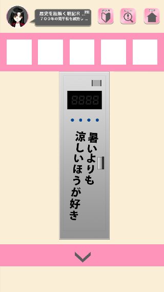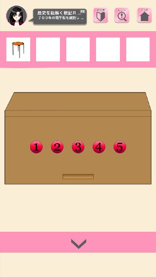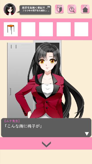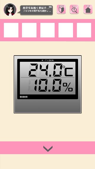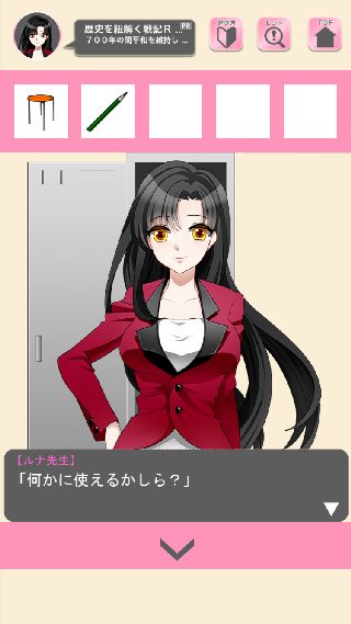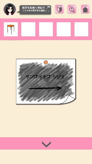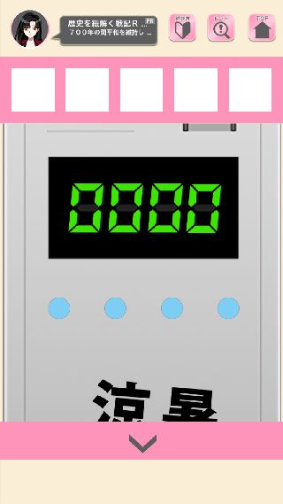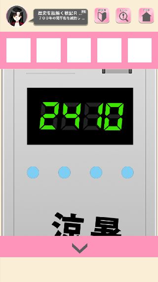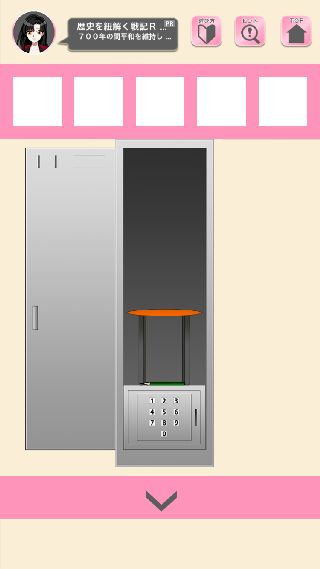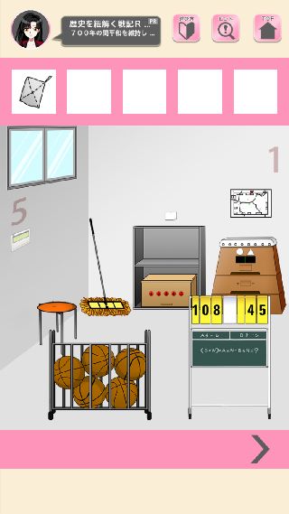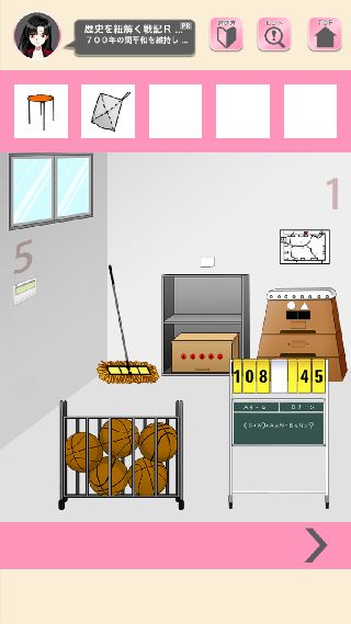 脱出ゲーム ルナ先生と僕~体育倉庫からの脱出~ 無料 4.0 評価する 送信する 第三章 右の壁の温度計を拡大して、『温度24°、湿度10%』を確認。 ロッカーの装置を拡大。 『2410』に合わせて開ける。 中から「椅子」と「鉛筆」を入手。 左に移動して、棚の上の紙を拡大。 「鉛筆」を使って、暗号を確認。 語呂合わせで『3515423』を表している。 棚の下の箱を拡大して、ボタンを押す。 中から「雑巾」を入手。 「椅子」を選択して、左上の窓を調べる。 窓に「雑巾」を使う。 第一章 第二章 第三章 第四章