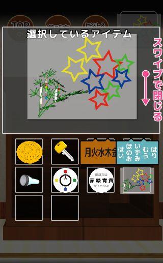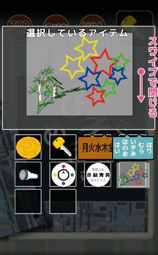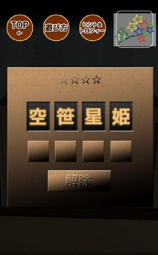 書かれている文字を「笹と星の絵」の星の位置に合わせて、「丸いプレート」をヒントに『赤緑青黄』の順で組み合わせると『そら、ささ、ほし、ひめ』となる。
