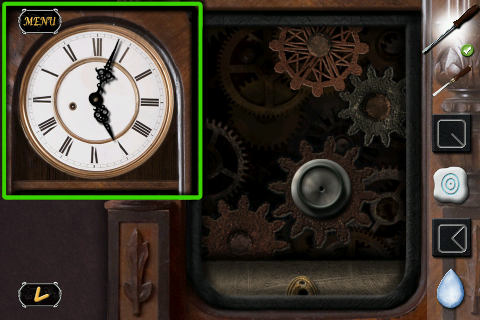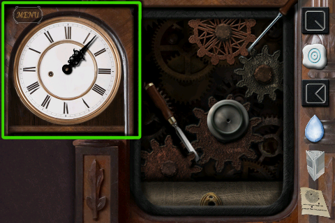時計の歯車に「ノミ」と「ドライバー」を『7:05』または『7:15』(先ほどの木のパーツの時間)に合わせて入れる。