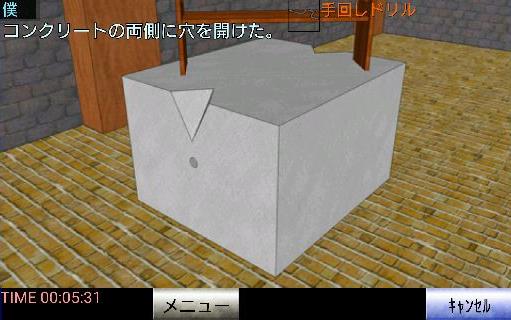コンクリートブロックの両側に「手回しドリル」で穴を開ける。