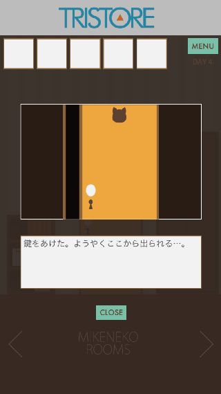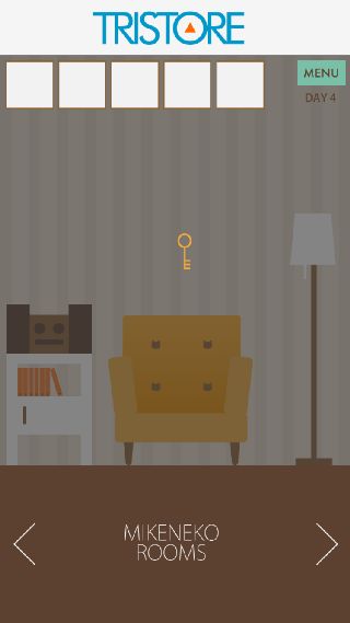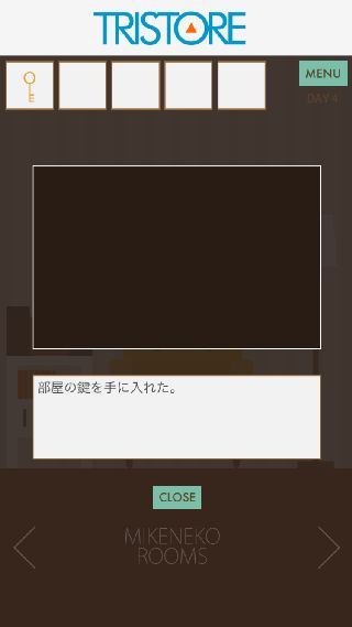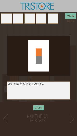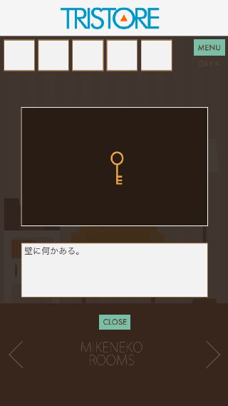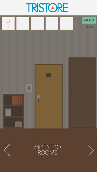 【脱出ゲーム】三毛猫ルームズ 無料 0 評価する 送信する TRISTORE DAY 4 壁のスイッチを拡大。 電気を消して、左に移動。 壁から「部屋の鍵」を入手。 右に移動して、扉を拡大。 「部屋の鍵」で開ける。 DAY 1 DAY 2 DAY 3 DAY 4 DAY 5 DAY 6 DAY 7 DAY 8 DAY 9 DAY 10 日記 DAY 1 日記 DAY 2 日記 DAY 3 日記 DAY 4 日記 DAY 5 日記 DAY 6 日記 DAY 7 日記 DAY 8 日記 DAY 9 日記 DAY 10