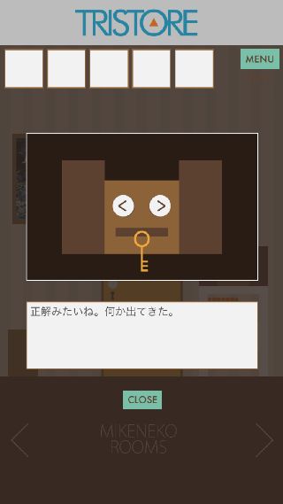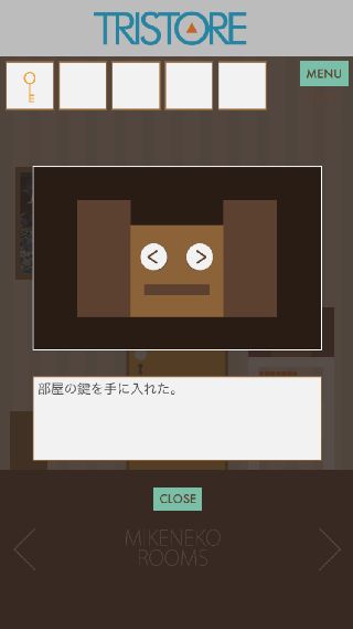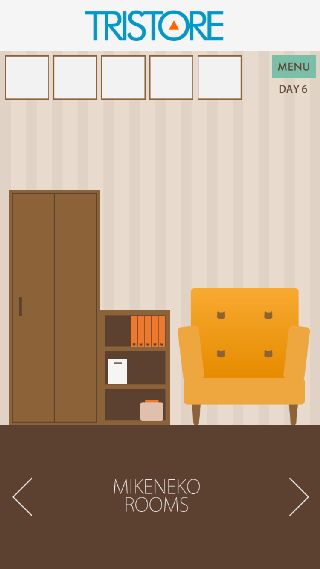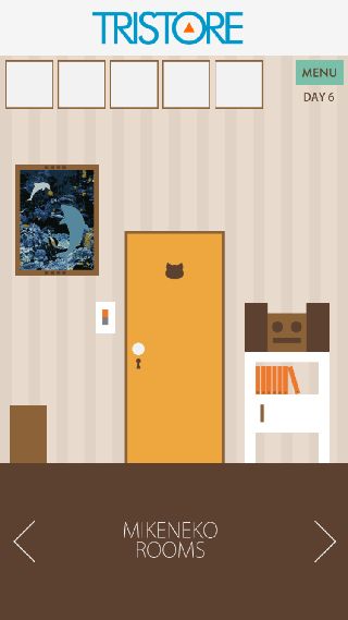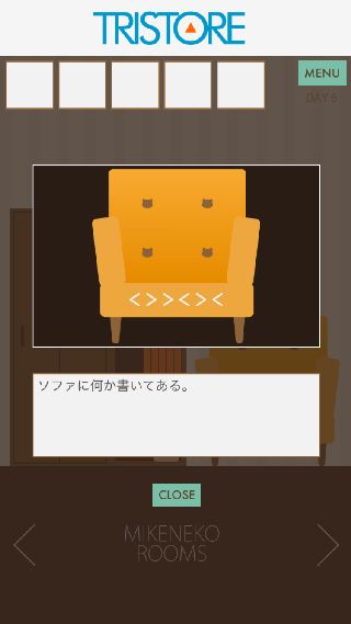 【脱出ゲーム】三毛猫ルームズ 無料 0 評価する 送信する TRISTORE DAY 6 右に移動。 ソファを拡大して、『<>><><』を確認。 左に移動。 棚の上のステレオを拡大して、『<>><><』の順で押す。 「部屋の鍵」を入手して、扉を拡大。 「部屋の鍵」で開ける。 DAY 1 DAY 2 DAY 3 DAY 4 DAY 5 DAY 6 DAY 7 DAY 8 DAY 9 DAY 10 日記 DAY 1 日記 DAY 2 日記 DAY 3 日記 DAY 4 日記 DAY 5 日記 DAY 6 日記 DAY 7 日記 DAY 8 日記 DAY 9 日記 DAY 10