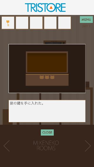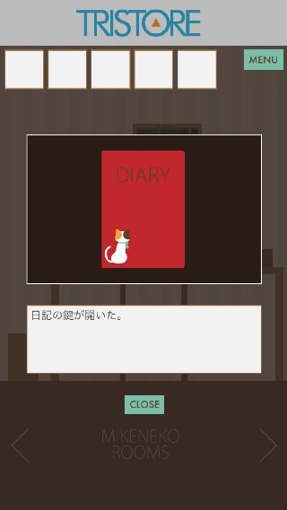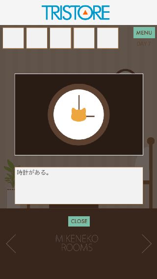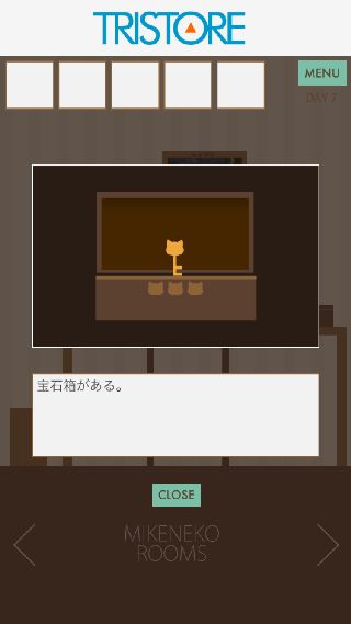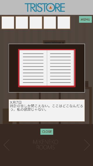 【脱出ゲーム】三毛猫ルームズ 無料 0 評価する 送信する TRISTORE 日記 DAY 7 宝石箱を拡大。 「猫の鍵」を入手して、日記を拡大。 「猫の鍵」で開けて、日記を読む。 時計の猫の数『1』を確認。 DAY 1 DAY 2 DAY 3 DAY 4 DAY 5 DAY 6 DAY 7 DAY 8 DAY 9 DAY 10 日記 DAY 1 日記 DAY 2 日記 DAY 3 日記 DAY 4 日記 DAY 5 日記 DAY 6 日記 DAY 7 日記 DAY 8 日記 DAY 9 日記 DAY 10