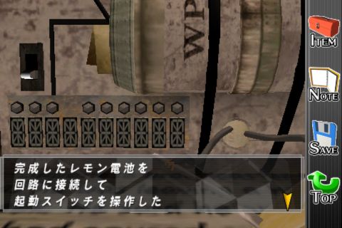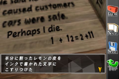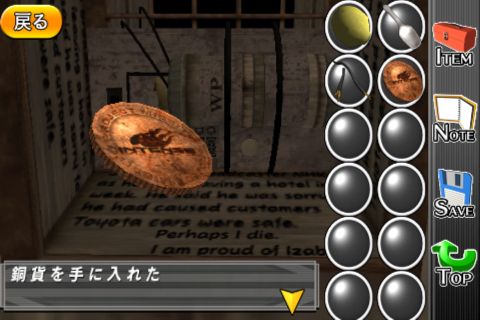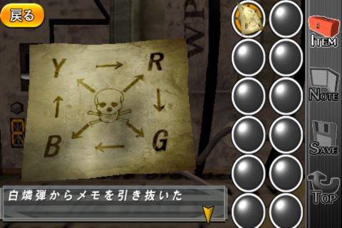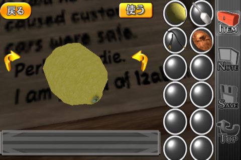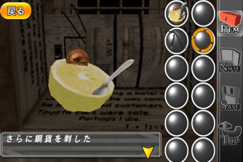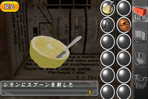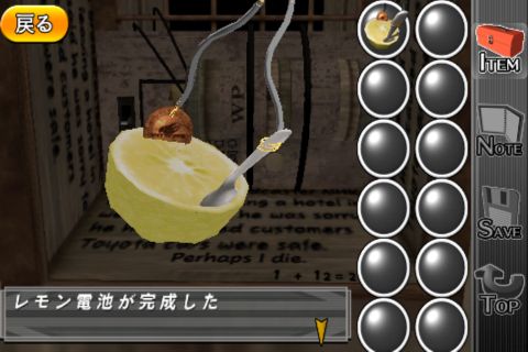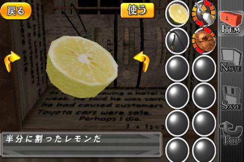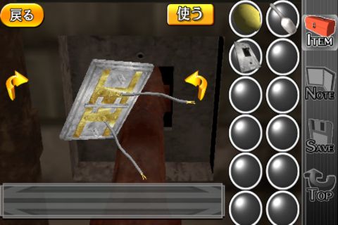 脱獄:密室からの脱出 プリズンブレイク 無料 3.5 評価する 送信する 攻略その13 「スイッチ」を裏返して「コード」を入手。 上に移動。 カバーを外して「銅貨」を入手。 文章の右下を拡大。 「レモン」を使うと数式が現れる。 「レモン」に「アルミのスプーン」を組み合わせる。 さらに「銅貨」「コード」を組み合わせて「レモン電池」を入手。 「レモン電池」を右の丸い部分に接続する。 『ONE+TWELVE』を先ほどの数式の通りに『TWO+ELEVEN』に入れ替える。 中央の「メモ」を引き抜く。 攻略その1 攻略その2 攻略その3 攻略その4 攻略その5 攻略その6 攻略その7 攻略その8 攻略その9 攻略その10 攻略その11 攻略その12 攻略その13 攻略その14 攻略その15 攻略その16 攻略その17