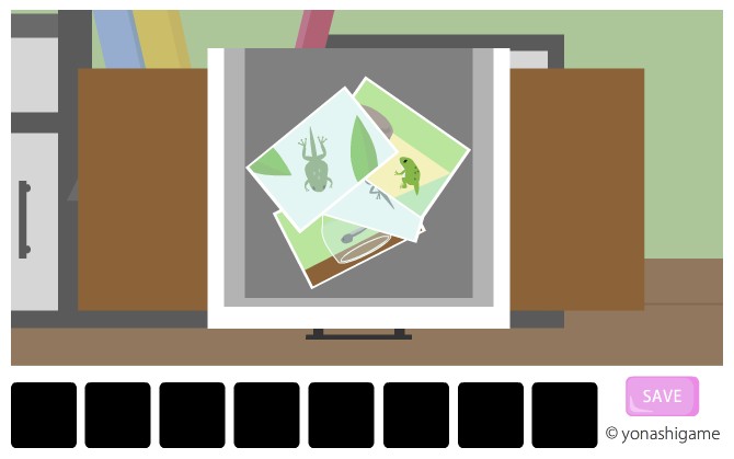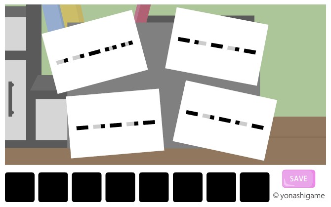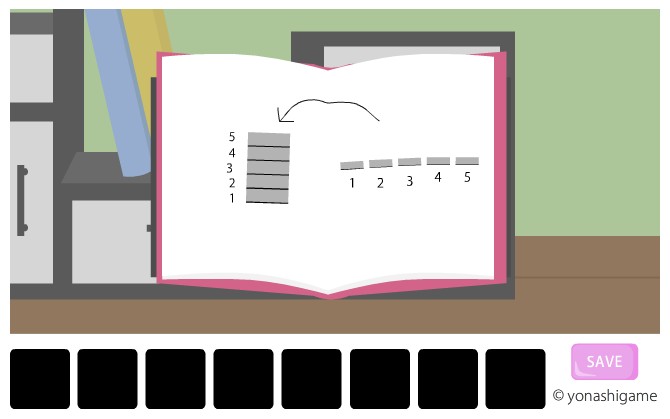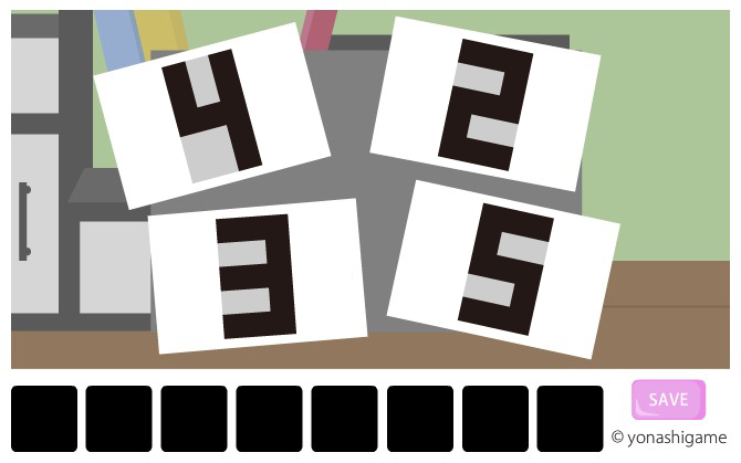 写真を裏返して、5つの図形を本のヒントのように積み上げると数字になる。