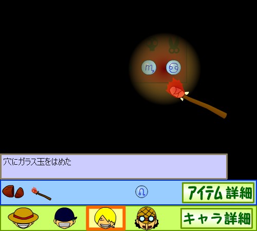 ドクロのシルエットの下に「ガラス玉(蠍座)」、ハサミのシルエットの下に「ガラス玉(蟹座)」をはめる。