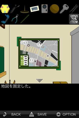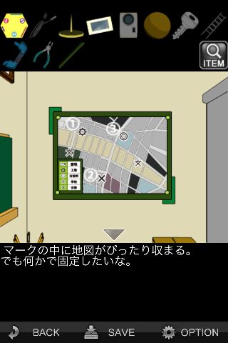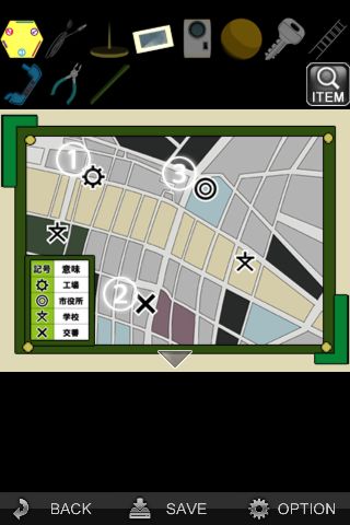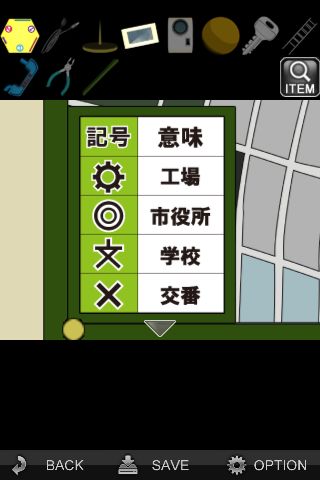 左下の記号の意味を確認して『①=工場、②=交番、③=市役所』を確認。