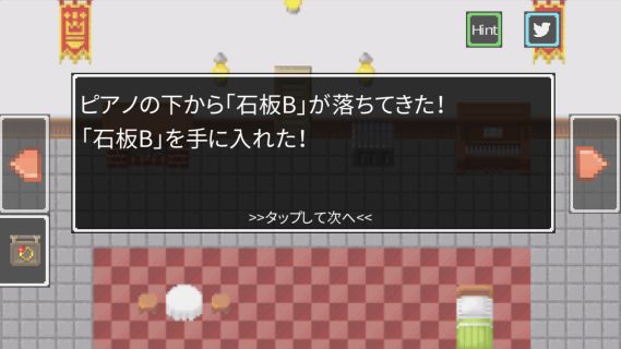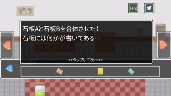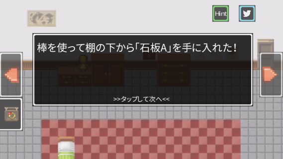 右に移動して、右の棚を調べて「木の棒」を使って「石版A」を入手。