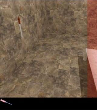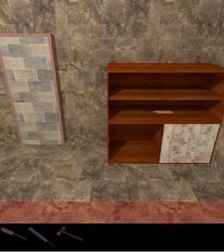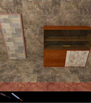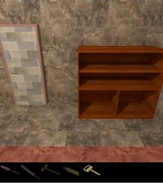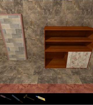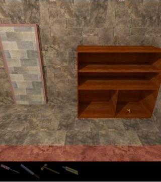 右に2回移動して、棚の左下の板を「ノコギリ」で切る。
