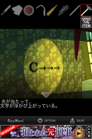 首を左に動かして、光の当たる部分を確認。『C→→→』は矢印の分だけアルファベットをずらす事を意味しており、『F』となる。