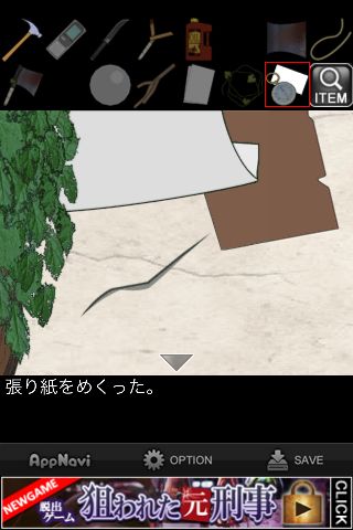 張り紙をめくって「ハンマー」でひび割れを叩く。
