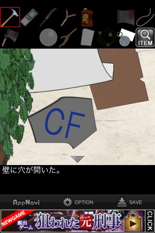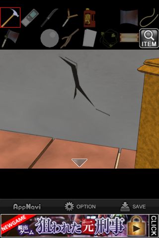 右の壁のひび割れを「ハンマー」で壊す。
