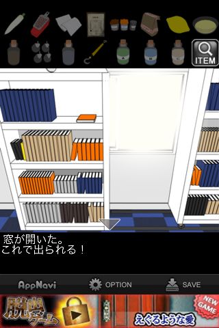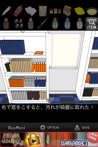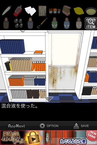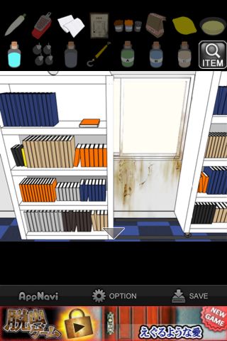 脱出ゲーム "特殊清掃~血迷う依頼人~" 無料 0 評価する 送信する IDAC CO.,LTD.(WaveA PTE.LTD.) 攻略その9 本棚の前へ。 汚れに「混合液」を使う。 「布」で綺麗にして、窓から脱出。 攻略その1 攻略その2 攻略その3 攻略その4 攻略その5 攻略その6 攻略その7 攻略その8 攻略その9