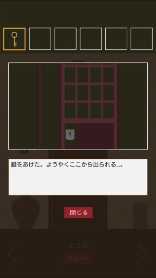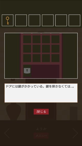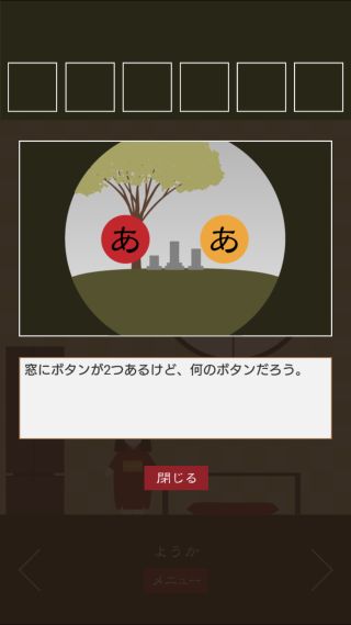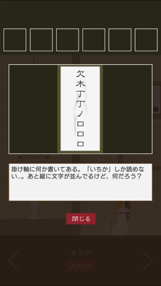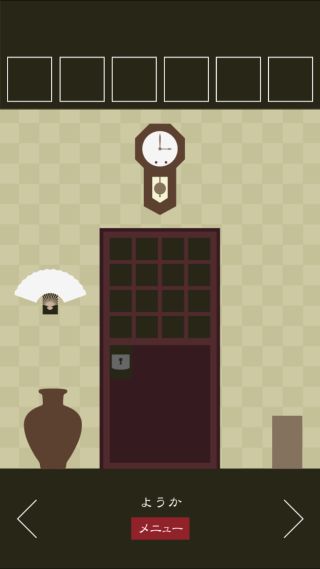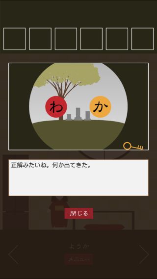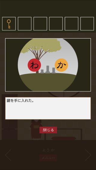 脱出ゲーム 三毛猫ルームズ2 無料 0 評価する 送信する TRISTORE ようか 右に移動。 掛け軸を拡大。 文字を組み合わせると、『和歌』となる。 右に移動。 窓を拡大して、『わか』に合わせる。 「鍵」を入手して、反対側に移動。 扉を拡大して、「鍵」を使う。 ついたち ふつか みっか よっか いつか むいか なのか ようか ここのか とおか ハッピーエンドの出し方 その1 ハッピーエンドの出し方 その2 ハッピーエンドの出し方 その3 ハッピーエンドの出し方 その4