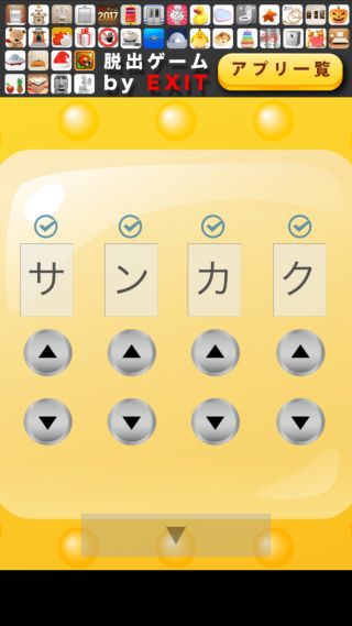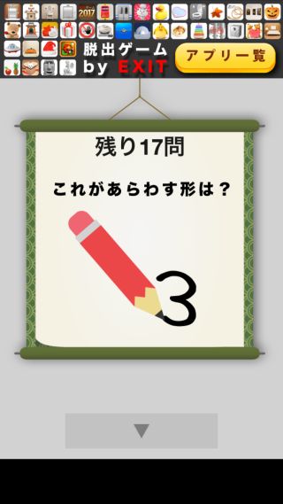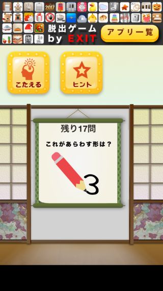 脱出ゲーム SHOUJI 無料 0 評価する 送信する KOJI SIMADA 3問目(残り17問) 『3書く=サンカク』となる。 『サンカク』に合わせる。 1問目(残り19問) 2問目(残り18問) 3問目(残り17問) 4問目(残り16問) 5問目(残り15問) 6問目(残り14問) 7問目(残り13問) 8問目(残り12問) 9問目(残り11問) 10問目(残り10問) 11問目(残り9問) 12問目(残り8問) 13問目(残り7問) 14問目(残り6問) 15問目(残り5問) 16問目(残り4問) 17問目(残り3問) 18問目(残り2問) 19問目(残り1問)