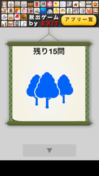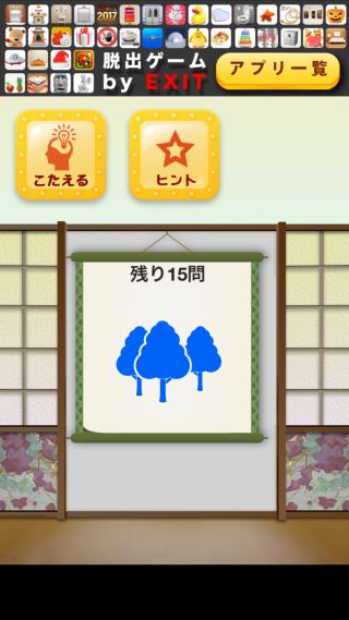 脱出ゲーム SHOUJI 無料 0 評価する 送信する KOJI SIMADA 5問目(残り15問) 『木×3=森』なので、『青森(アオモリ)』となる。 『アオモリ』に合わせる。 1問目(残り19問) 2問目(残り18問) 3問目(残り17問) 4問目(残り16問) 5問目(残り15問) 6問目(残り14問) 7問目(残り13問) 8問目(残り12問) 9問目(残り11問) 10問目(残り10問) 11問目(残り9問) 12問目(残り8問) 13問目(残り7問) 14問目(残り6問) 15問目(残り5問) 16問目(残り4問) 17問目(残り3問) 18問目(残り2問) 19問目(残り1問)