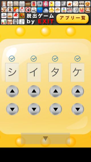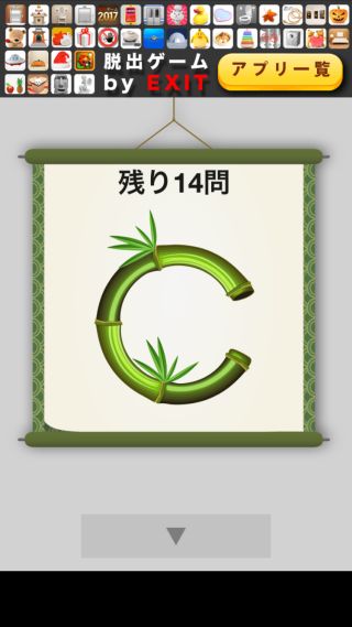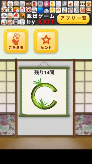 脱出ゲーム SHOUJI 無料 0 評価する 送信する KOJI SIMADA 6問目(残り14問) 『Cが竹=シイタケ』となる。 『シイタケ』に合わせる。 1問目(残り19問) 2問目(残り18問) 3問目(残り17問) 4問目(残り16問) 5問目(残り15問) 6問目(残り14問) 7問目(残り13問) 8問目(残り12問) 9問目(残り11問) 10問目(残り10問) 11問目(残り9問) 12問目(残り8問) 13問目(残り7問) 14問目(残り6問) 15問目(残り5問) 16問目(残り4問) 17問目(残り3問) 18問目(残り2問) 19問目(残り1問)