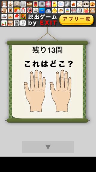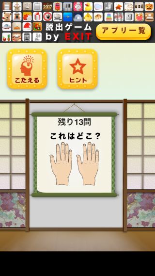 脱出ゲーム SHOUJI 無料 0 評価する 送信する KOJI SIMADA 7問目(残り13問) 『甲×2=コウコウ』となる。 『コウコウ』に合わせる。 1問目(残り19問) 2問目(残り18問) 3問目(残り17問) 4問目(残り16問) 5問目(残り15問) 6問目(残り14問) 7問目(残り13問) 8問目(残り12問) 9問目(残り11問) 10問目(残り10問) 11問目(残り9問) 12問目(残り8問) 13問目(残り7問) 14問目(残り6問) 15問目(残り5問) 16問目(残り4問) 17問目(残り3問) 18問目(残り2問) 19問目(残り1問)