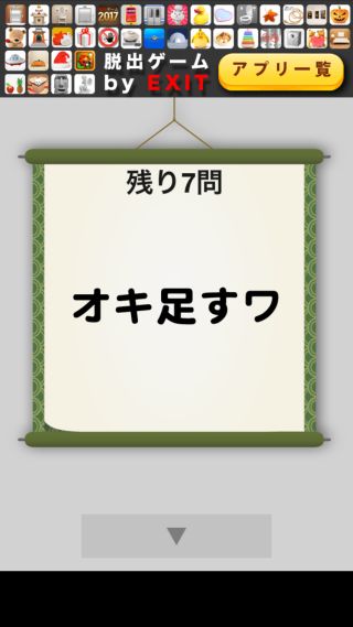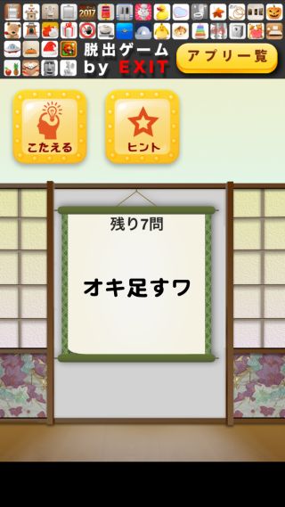 脱出ゲーム SHOUJI 無料 0 評価する 送信する KOJI SIMADA 13問目(残り7問) 『オキ+ワ』とすると、『+→ナ』と読める。 『オキナワ』に合わせる。 1問目(残り19問) 2問目(残り18問) 3問目(残り17問) 4問目(残り16問) 5問目(残り15問) 6問目(残り14問) 7問目(残り13問) 8問目(残り12問) 9問目(残り11問) 10問目(残り10問) 11問目(残り9問) 12問目(残り8問) 13問目(残り7問) 14問目(残り6問) 15問目(残り5問) 16問目(残り4問) 17問目(残り3問) 18問目(残り2問) 19問目(残り1問)