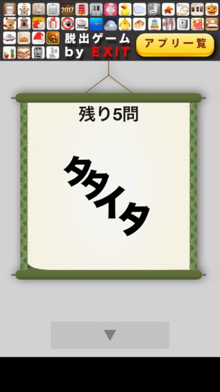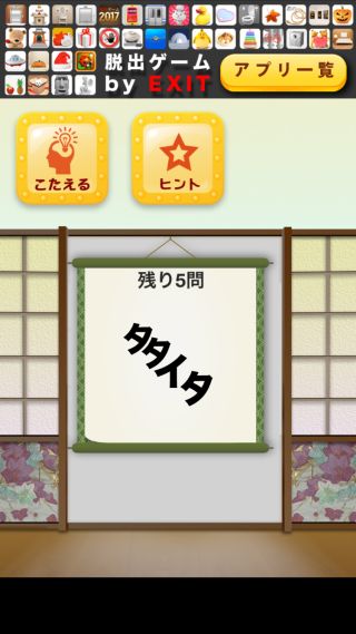 脱出ゲーム SHOUJI 無料 0 評価する 送信する KOJI SIMADA 15問目(残り5問) 『多イタ』と読む。 『オオイタ』に合わせる。 1問目(残り19問) 2問目(残り18問) 3問目(残り17問) 4問目(残り16問) 5問目(残り15問) 6問目(残り14問) 7問目(残り13問) 8問目(残り12問) 9問目(残り11問) 10問目(残り10問) 11問目(残り9問) 12問目(残り8問) 13問目(残り7問) 14問目(残り6問) 15問目(残り5問) 16問目(残り4問) 17問目(残り3問) 18問目(残り2問) 19問目(残り1問)