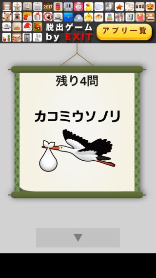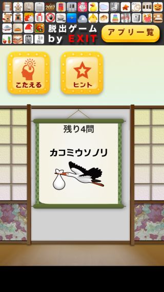 脱出ゲーム SHOUJI 無料 0 評価する 送信する KOJI SIMADA 16問目(残り4問) 『コウノトリ→コウノ取り』として文字を抜く。 『カミソリ』に合わせる。 1問目(残り19問) 2問目(残り18問) 3問目(残り17問) 4問目(残り16問) 5問目(残り15問) 6問目(残り14問) 7問目(残り13問) 8問目(残り12問) 9問目(残り11問) 10問目(残り10問) 11問目(残り9問) 12問目(残り8問) 13問目(残り7問) 14問目(残り6問) 15問目(残り5問) 16問目(残り4問) 17問目(残り3問) 18問目(残り2問) 19問目(残り1問)
