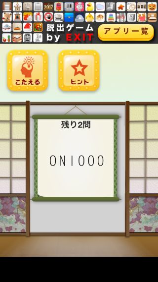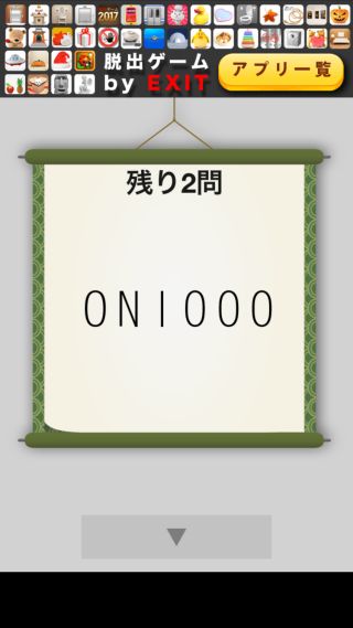 脱出ゲーム SHOUJI 無料 0 評価する 送信する KOJI SIMADA 18問目(残り2問) 『ON=オン、1000=セン』となる。 『オンセン』に合わせる。 1問目(残り19問) 2問目(残り18問) 3問目(残り17問) 4問目(残り16問) 5問目(残り15問) 6問目(残り14問) 7問目(残り13問) 8問目(残り12問) 9問目(残り11問) 10問目(残り10問) 11問目(残り9問) 12問目(残り8問) 13問目(残り7問) 14問目(残り6問) 15問目(残り5問) 16問目(残り4問) 17問目(残り3問) 18問目(残り2問) 19問目(残り1問)