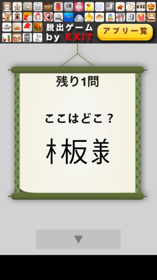 脱出ゲーム SHOUJI 無料 0 評価する 送信する KOJI SIMADA 19問目(残り1問) 『様(サマ)の間に板(イタ)』を挟む。 『サイタマ』に合わせる。 1問目(残り19問) 2問目(残り18問) 3問目(残り17問) 4問目(残り16問) 5問目(残り15問) 6問目(残り14問) 7問目(残り13問) 8問目(残り12問) 9問目(残り11問) 10問目(残り10問) 11問目(残り9問) 12問目(残り8問) 13問目(残り7問) 14問目(残り6問) 15問目(残り5問) 16問目(残り4問) 17問目(残り3問) 18問目(残り2問) 19問目(残り1問)