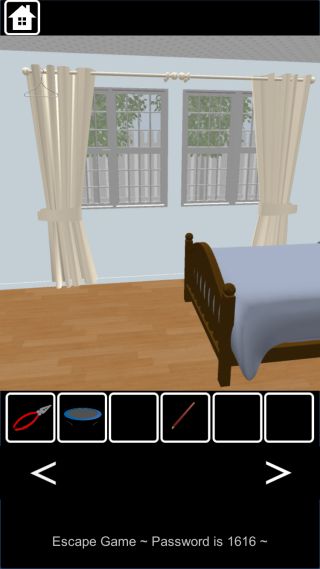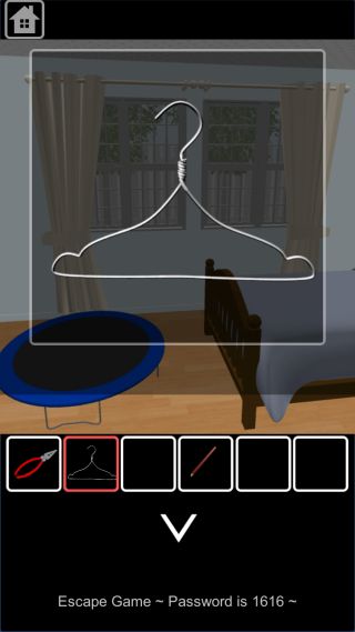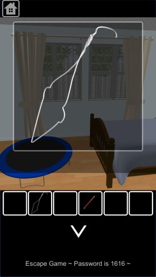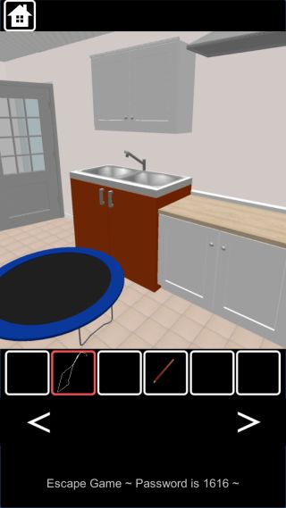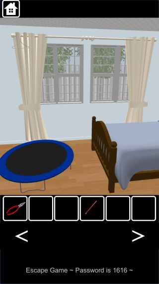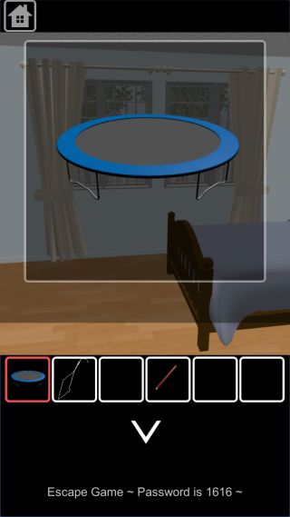 右に移動して、床に「トランポリン」を置いて窓から脱出するとバッドエンドになる。