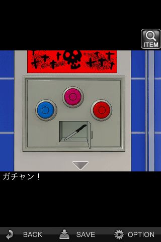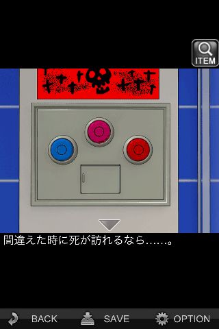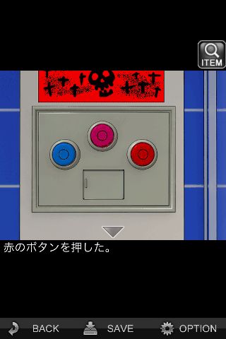 下の装置の赤いボタンを押す。その他のボタンを押すとその場でバッドエンドとなる。