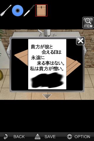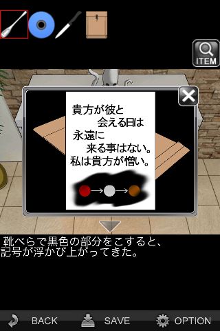 「封筒」の手紙の黒い部分に「靴べら」を使って『赤→白→茶』を確認。