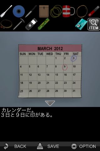 給湯室のカレンダーに青○と赤○の数字があるので、レコーダーの裏に書かれた暗号に当てはめると『N=9、S=3』となる。