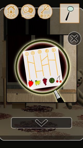 「虫眼鏡」を使って、あみだくじから『ブドウ、イチゴ、チェリー、スイカ、バナナ』の順を確認。